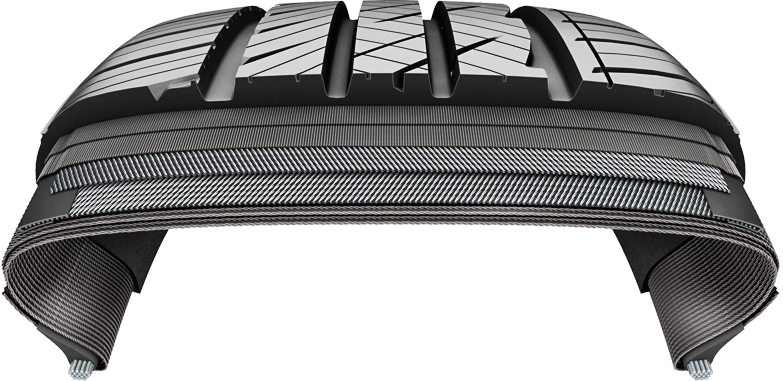 A folded belt edge tape design is incorporated between the tire’s two tread belts to improve handling performance in high speed.