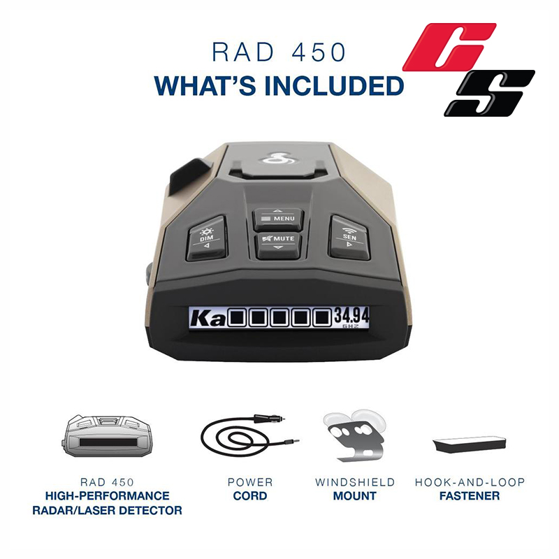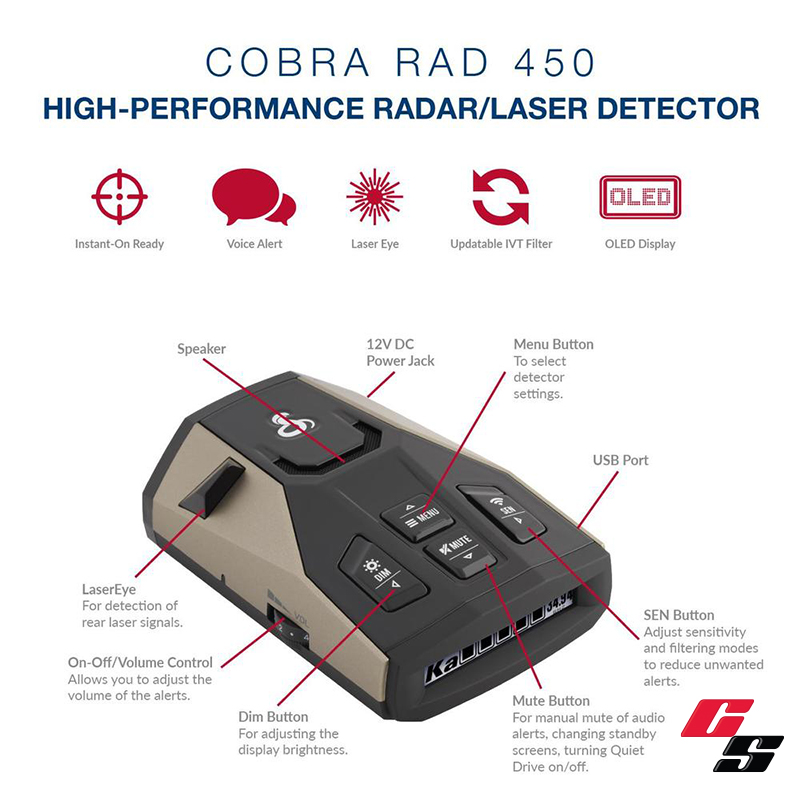 The Cobra RAD 450 keeps drivers aware of their surroundings while protecting them against all radar and laser guns used today. Its Anti-Falsing Circuitry & Updateable In-Vehicle Technology (IVT) Filter not only reduces false alerts from blind spot systems and traffic flow monitoring devices but also eliminates erroneous alerts from sources like collision avoidance systems, so users hear just what they need to hear. The OLED display and VoiceAlert provide intuitive band identification and easy-to-understand alerts for an accurate and informed drive. The RAD 450 comes pre-programmed for both English & Spanish voice and text alerts.