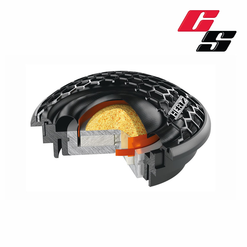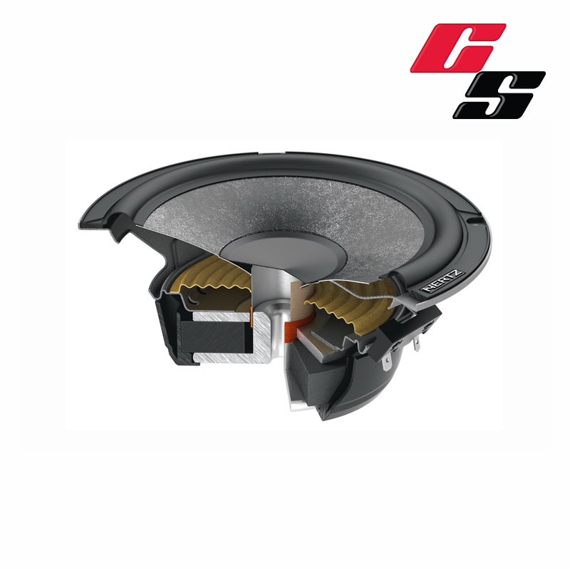 Two-way systems Hertz CK 165 features the new C 26 tweeter featuring a 26 mm (1 in.) Tetolon® dome and 20 mm (0.8 in.) voice coil for detailed and natural reproduction of medium-high frequencies. The R&D team worked extensively to optimize the C 26 dispersion characteristics to maximize performance on the listening point, with a natural and progressive roll-off and a natural timbre that favors frequency linearity. Much time was invested in the research of the perfect material for the C 165 woofer cones: through a long process of customization of the materials, SPP-M was selected (Semi Pressed Paper-Mica), which preserves the natural sound of the semi-pressed paper and enhances it with Mica powder improving rigidity.