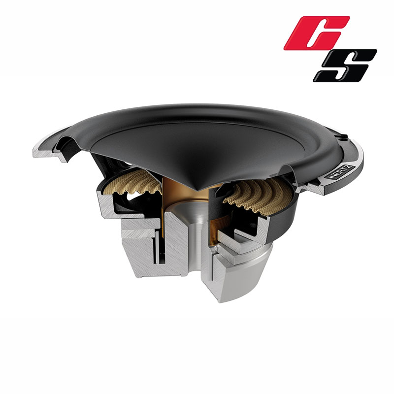 An aluminum alloy speaker basket with built-in venting provides a strong, smart base for the 6-1/2″ woofer’s impressive efficiency. To transfer more air with greater precision, Hertz employs a “Boundary Free” rubber surround with its improved pressed pulp and cotton fiber woofer. The V-cone configuration of the woofer increases dispersion and contributes to audible lows. Superior damping is also important to the sound of these speakers; reduced resonance decreases distortion for a more realistic sound.