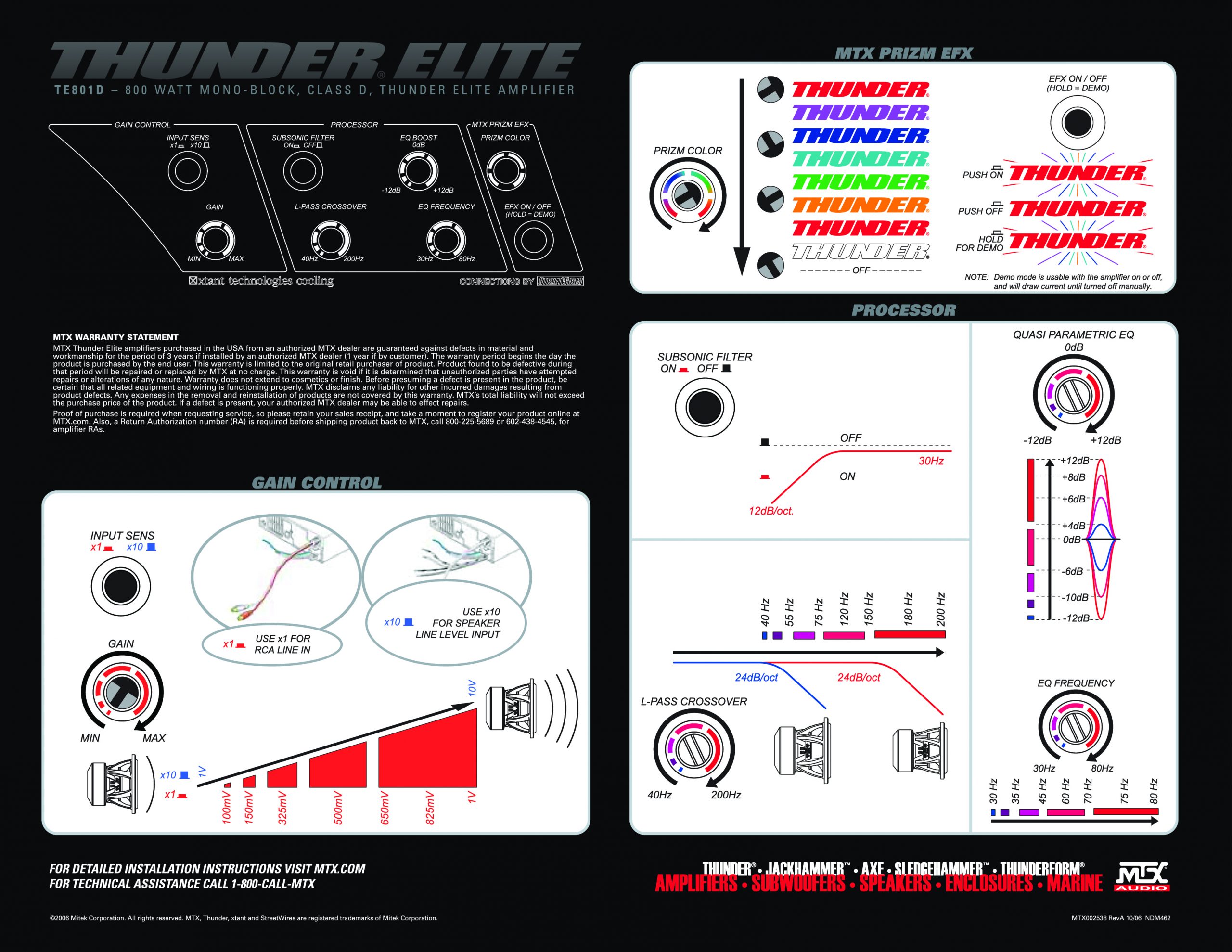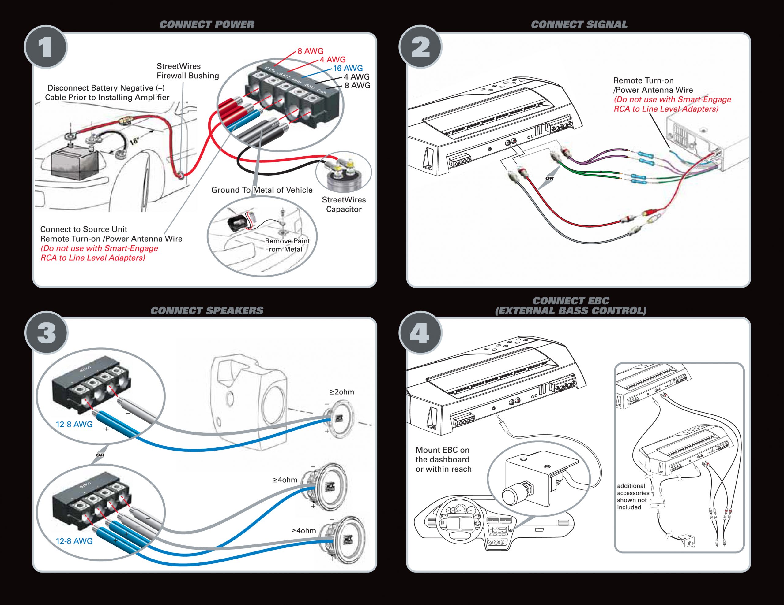 - 4-gauge power and ground leads recommended — wiring and hardware not included with amplifier