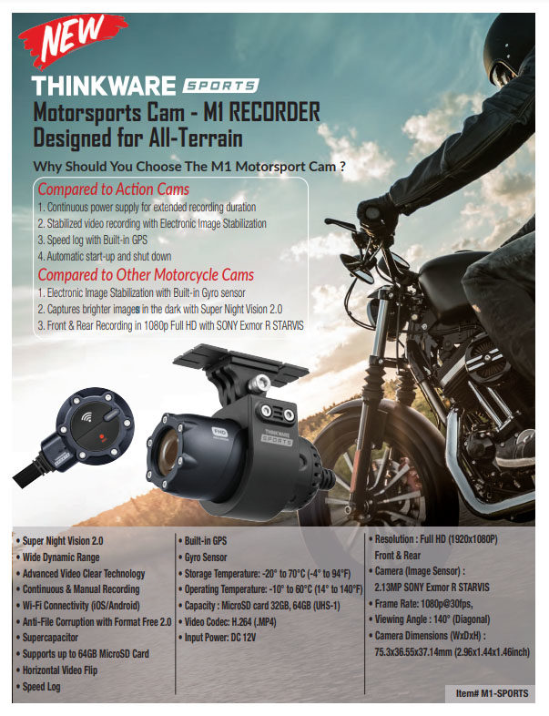 2-Channel Motosports Cam includes Front & Rear 1080P cameras with 2.13MP Sony Exmor R Starvis CMOS sensors. Includes 32GB Micro SD card and card reader included. Compatible up to 64GB. Anti file corruption 2.0. Video codec v.264. The angle of View – 140 degrees, with Smart Focus System. The resolution, FPS – 1920x1080P, Max 30fps Improved Wifi performance allows streaming while recording. Electronic Image Stabilization with built-in Gyro Sensor. 2-Button remote controller. Super Night Vision 2.0 – increases exposure at low-light settings. Built-in power management supercapacitor. Built-in GPS with Speed Log. Weatherproof IP65 rated. Android & iOS app, PC & Apple Mac software